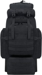 • Rugged internal frame tactical backpak made from 1000D polyester fabric for men and women. Padded hip belt, adjustable shoulder harness with sternum strap, narrow pack design for excellent movement in different environments. Good option as a camping backpack, hunting backpack, backpacking backpack, trekking backpack, bugout bag, so on.